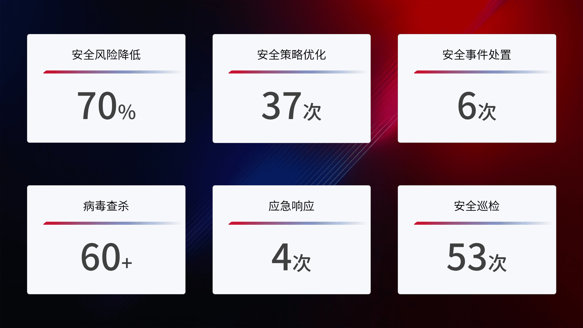 提供全面的安全事件报告体系,,包括处置报告、、周报、、季度和年度总结,,,,结合持续监控,,,帮助客户深入了解网络安全状况。。。
