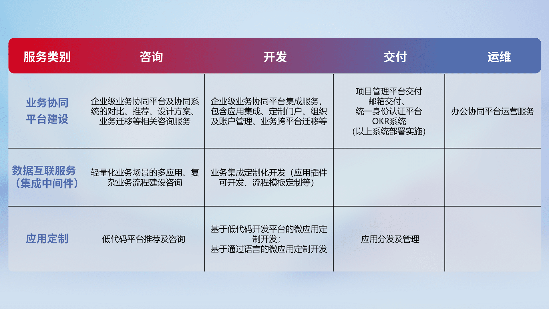 针对钉钉、、、、企微、、、IDaas等平台级产品提供产品的规划、、、方案、、交付、、定制化开发等服务,,实现如统一协同办公、、、智能客户服务、、、混合会议管理、、、智能数据查询、、、、等业务场景,,,,实现数字化转型。。。。